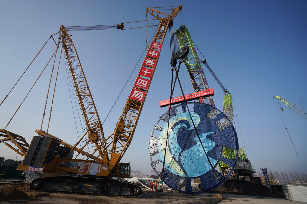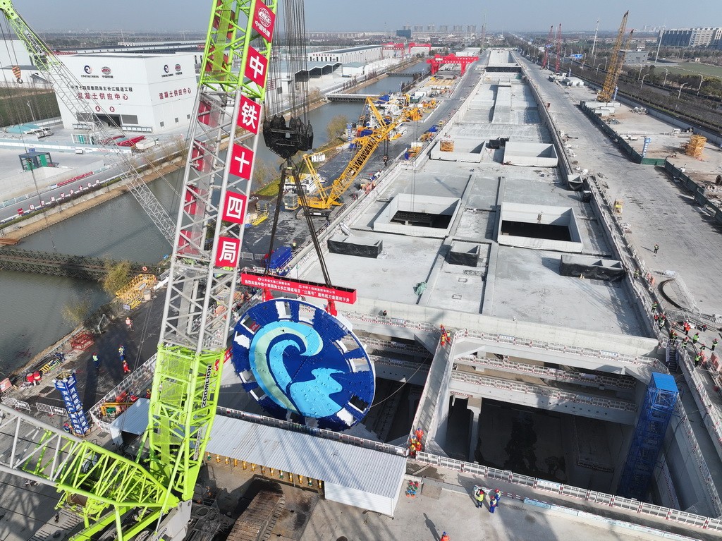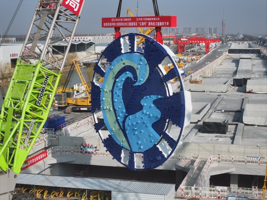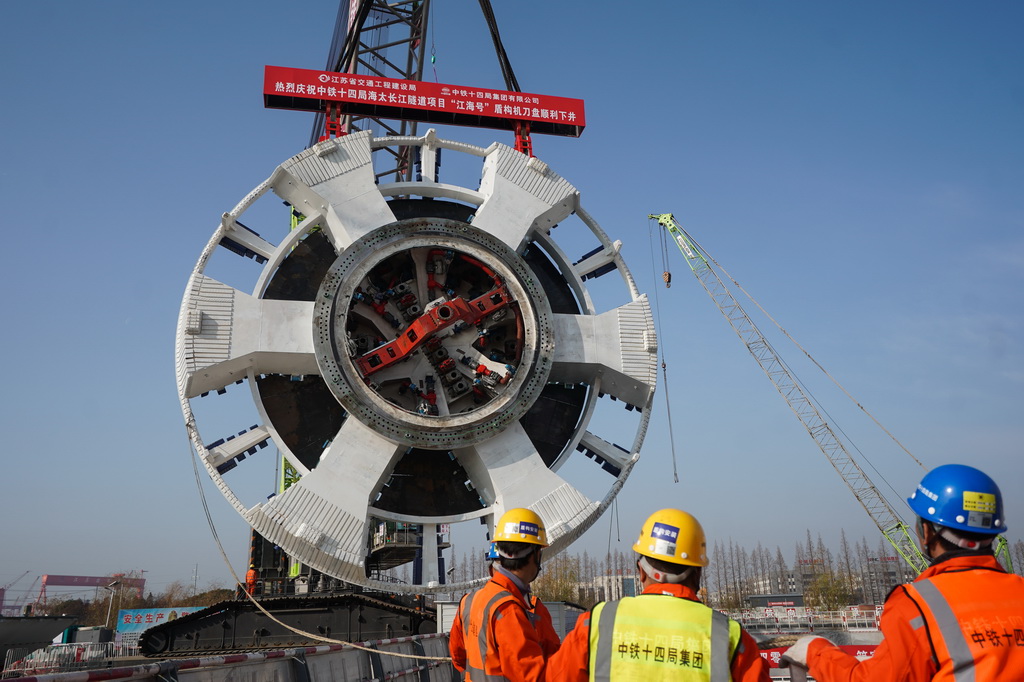 1月22日,江苏海太长江隧道工程南通市海门侧施工现场举行“江海号”盾构机刀盘下井仪式。该盾构机开挖直径16.64米,刀盘的下井标志着重大部件组装基本完成,即将进入始发调试阶段。海太长江隧道位于江苏省长江入海口区域,北起南通海门区,南至苏州太仓市,全长39.07公里,其中过江隧道长11.185公里。新华社记者 季春鹏 摄